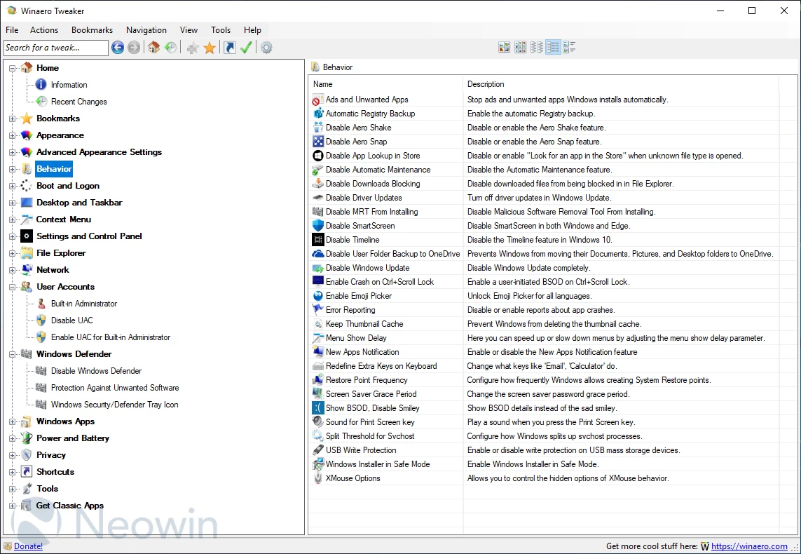 Winaero Tweaker is an an all-in-one customization utility that helps you to tweak Windows in just a few simple clicks. The program includes tweaks for every version of operating system from Windows 7 to Windows 11. Winaero Tweaker automatically detects the version of Windows OS you’re running and shows tweaks and customization options accordingly. The software can be installed as a portable app so you can take it with you as you move from one computer to another.